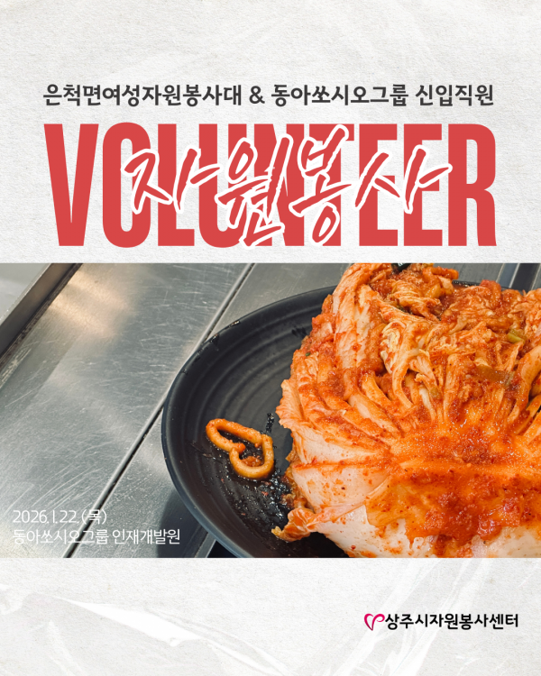 2026. 1. 22.(목) 동아쏘시오그룹 신입직원 50명이 김장 담그기 자원봉사에 참여하고, 은척면여성자원봉사대 회원 10명이 리더로 함께 참여했습니다.